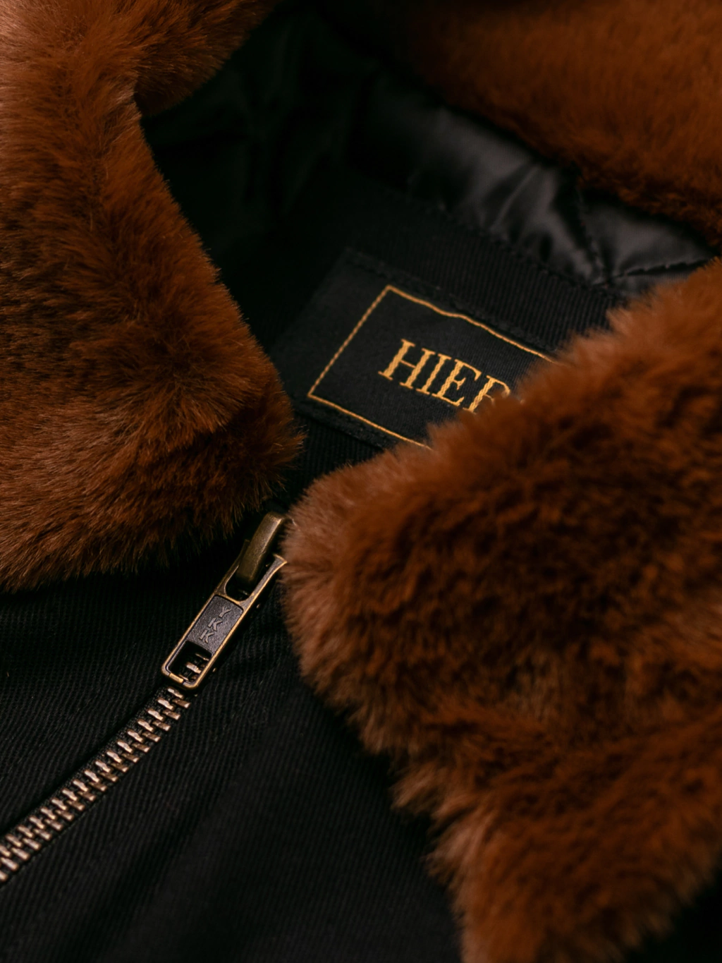 Campera confeccionada con una tela plana resistente, forrada con guata matelasse que proporciona más abrigo a la prenda. Cuello con piel sintética extra suave. Con 2 bolsillos con tapa y puños con broches metálicos.
