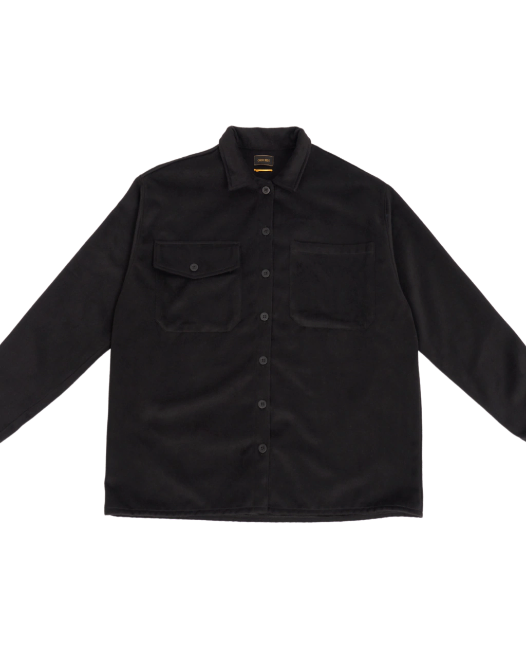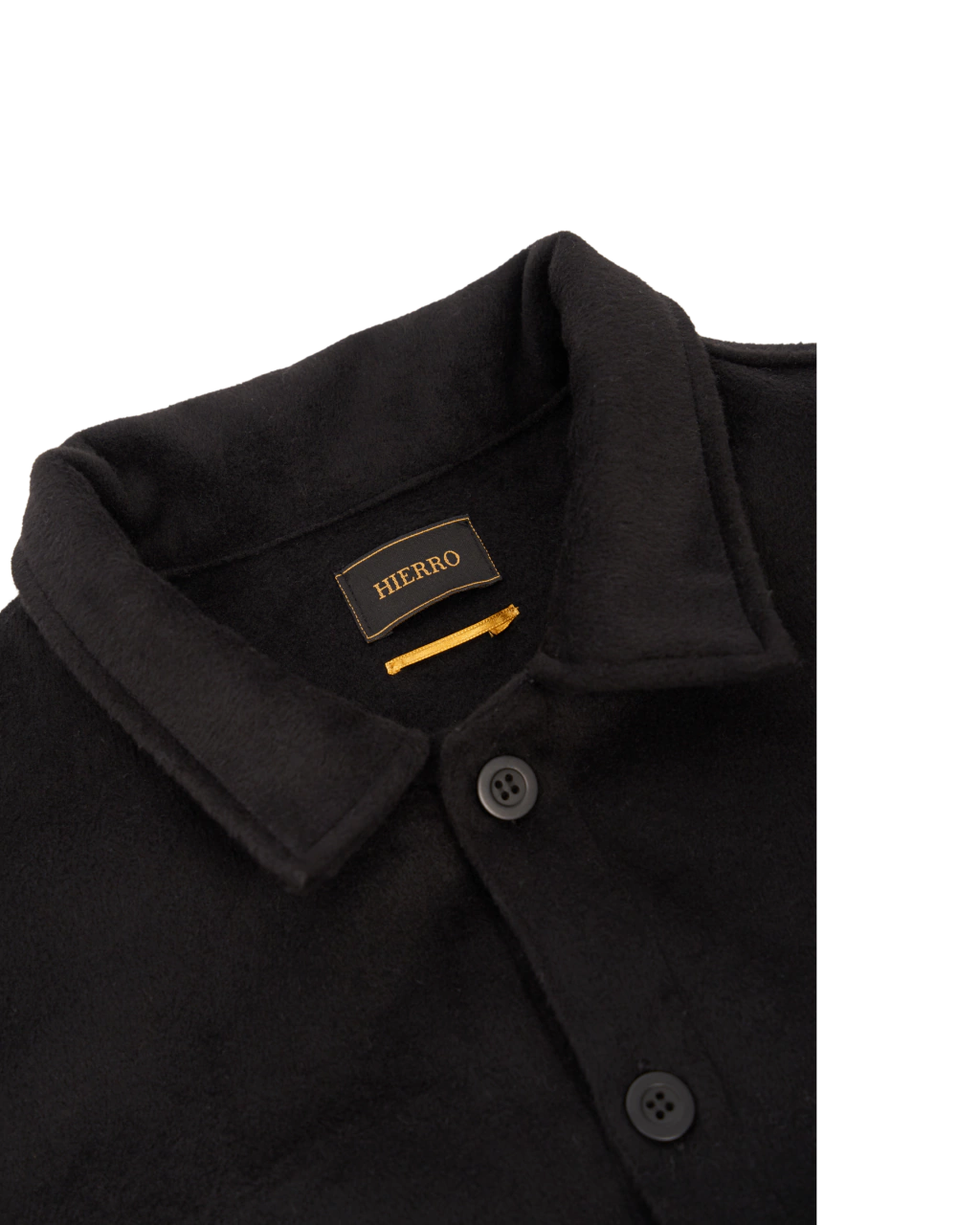 Camisaco de paño con bolsillos delanteros con tapa y botón, cartera con botones a la vista al tono.